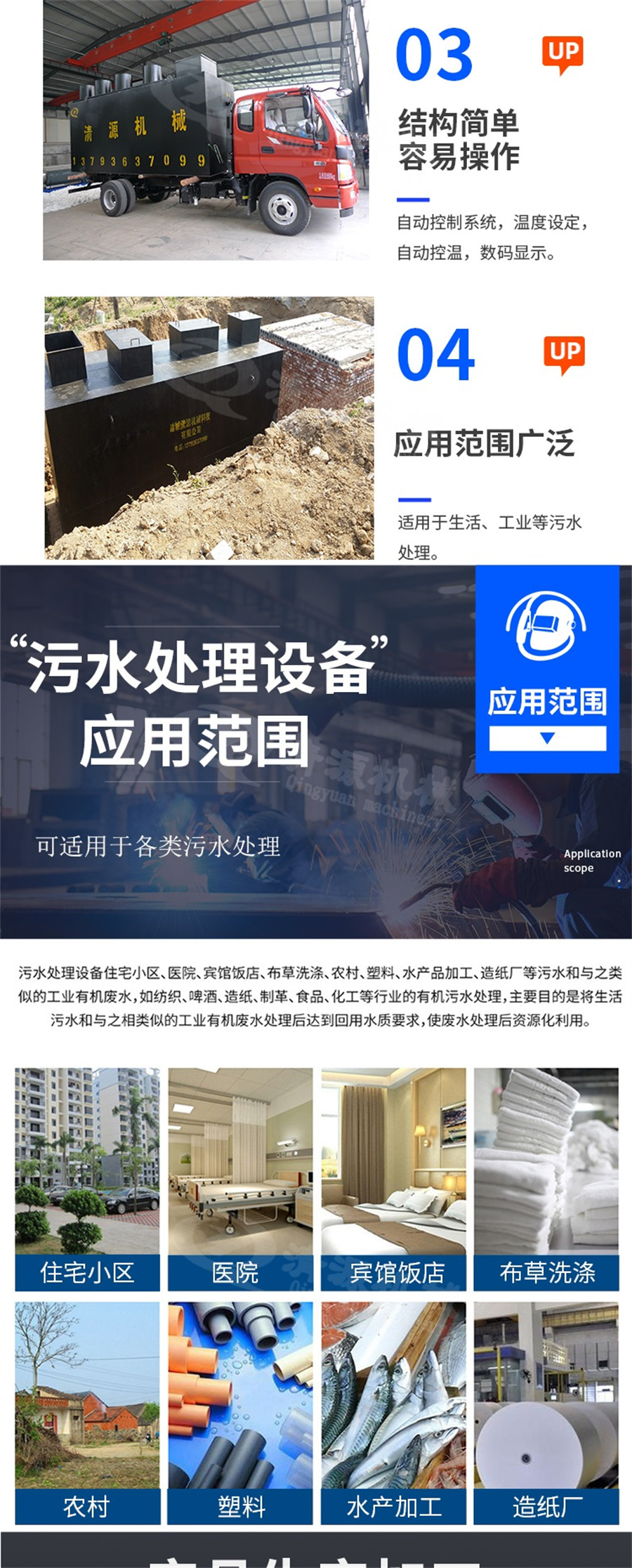 3、設(shè)備主要適用于住宅區(qū)、賓館、碼頭、機(jī)場、療養(yǎng)院、廠礦等行業(yè)的生活污水和類似的工業(yè)廢水。