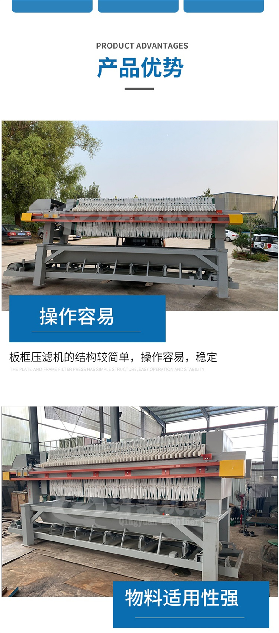 三、優(yōu)點(diǎn):板框式壓濾機(jī)的優(yōu)點(diǎn)是:結(jié)構(gòu)較簡單,操作容易,運(yùn)行穩(wěn)定,保養(yǎng)方便;過濾面積選擇范圍靈活,占地少;對(duì)物料適應(yīng)性強(qiáng),適用于各種中小型污泥脫水處理的場合。