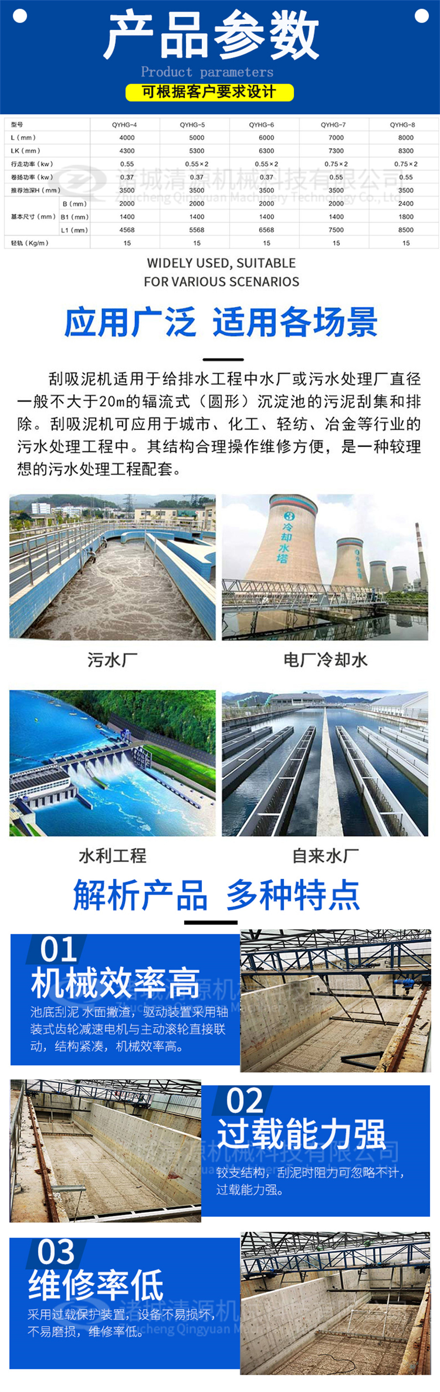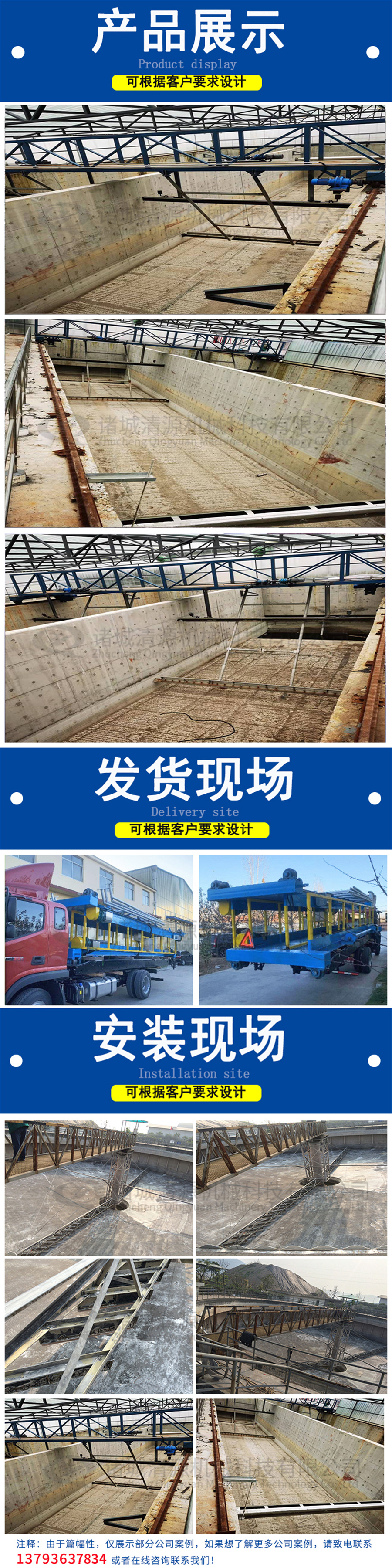 桁車(chē)式提耙刮泥機(jī)廣泛用于平流式沉淀池的污泥刮、吸。本刮吸泥機(jī)結(jié)構(gòu)緊湊,工作可靠,并配有自動(dòng)控制和過(guò)載保護(hù)系統(tǒng)。軌道間距4米以下刮吸泥機(jī)采用中間集中驅(qū)動(dòng)。間距6米以上時(shí)采用兩端同步驅(qū)動(dòng)。用于污水處理廠、自來(lái)水廠平流沉淀池沉降在池底的污泥刮到出泥口,通過(guò)刮泥系統(tǒng),邊行走邊刮泥,然后利用污泥泵將污泥排出池外。