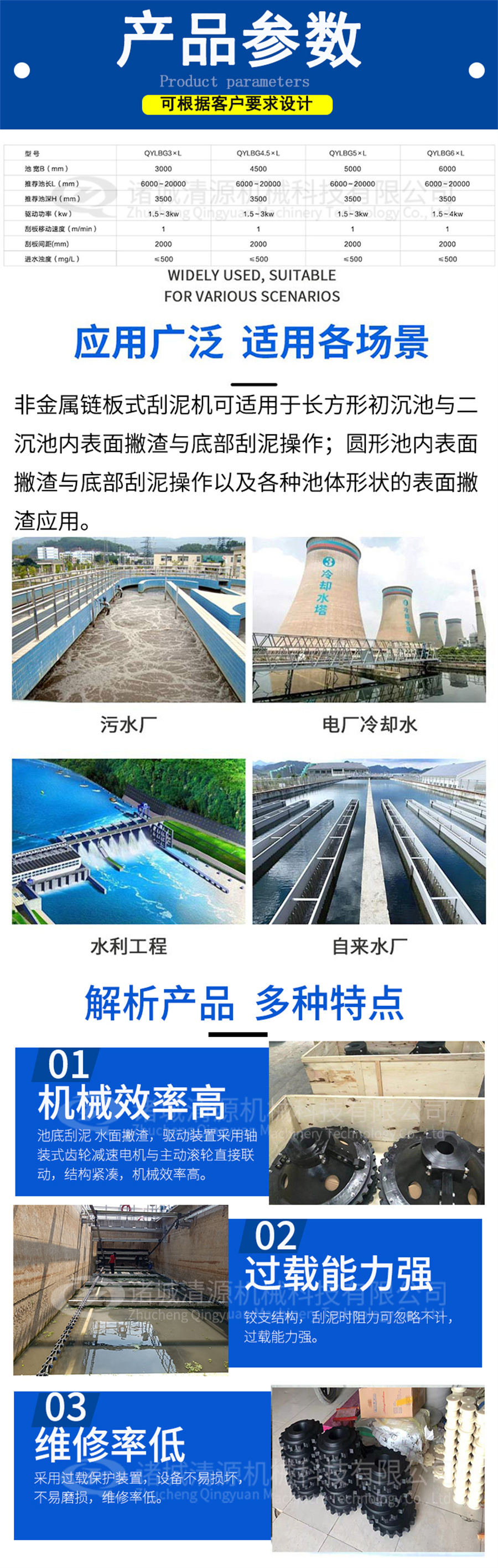 非金屬鏈條式刮泥機(jī),是一種刮泥設(shè)備,可適用于長(zhǎng)方形初沉池與二沉池內(nèi)表面撇渣與底部刮泥操作。