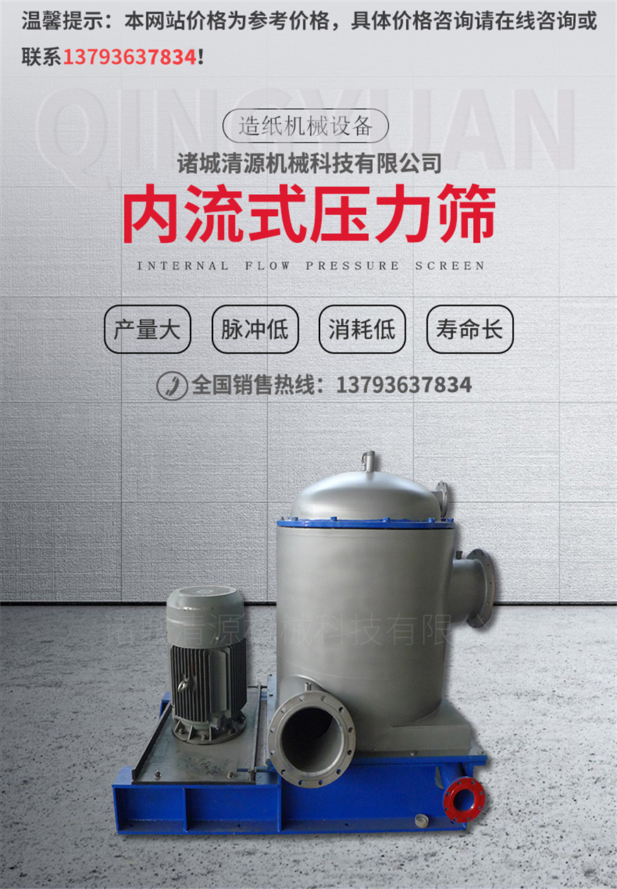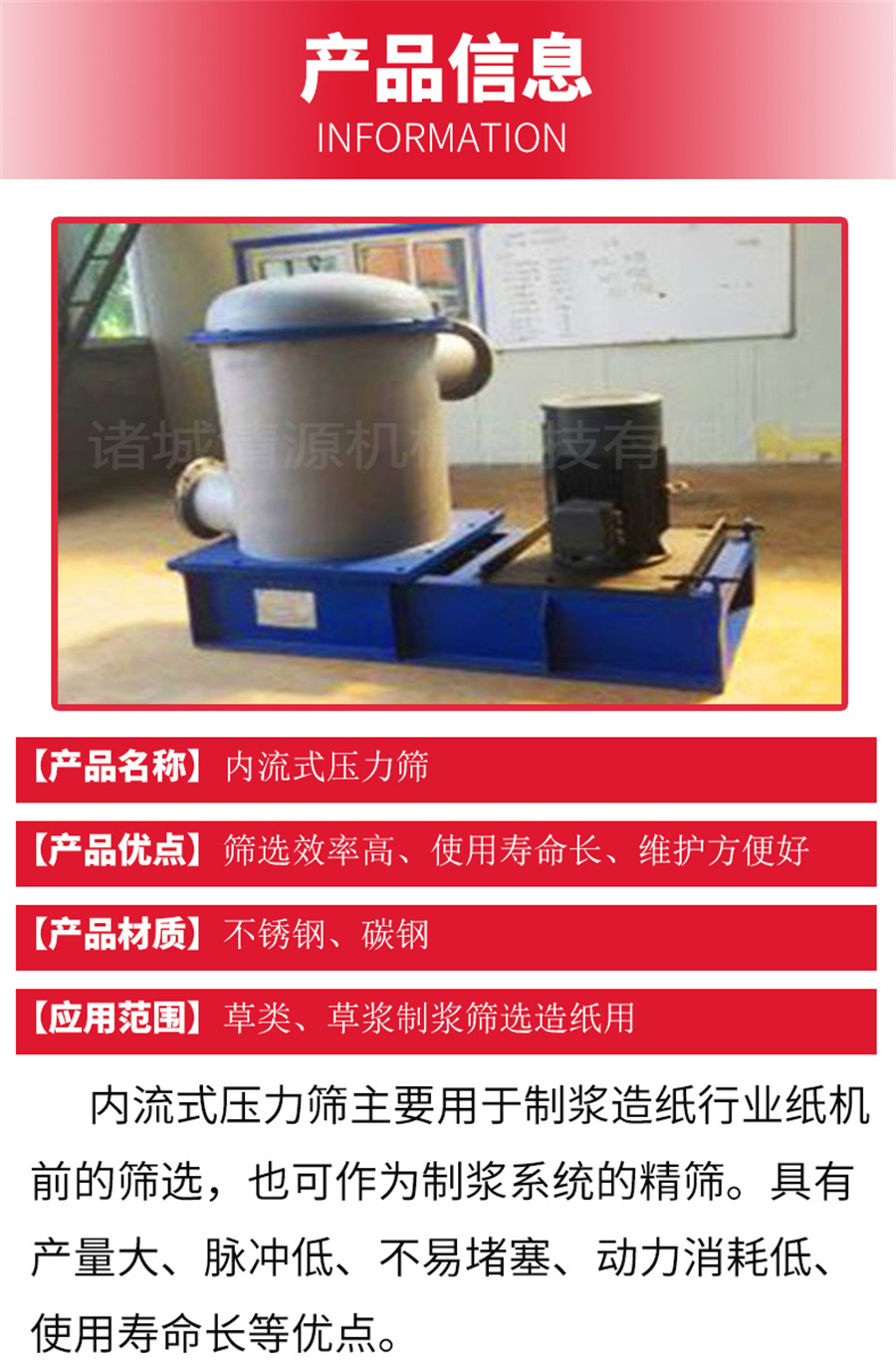 內(nèi)流式壓力篩是當(dāng)代造紙行業(yè)較好的篩選設(shè)備。內(nèi)流式壓力篩適用于化學(xué)漿、磨木漿及廢紙漿的篩選。目前多用于造紙機(jī)前的漿料精選,對(duì)于提高成品紙的檔次,降低能源消耗起著重要的作用。