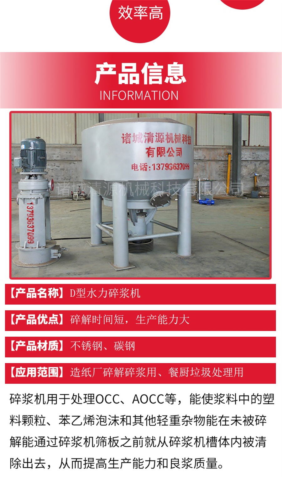 此外,我公司不僅生產低濃水力碎漿機,還生產D型水力碎漿機、地埋式污水處理設備、氣浮機、污泥壓濾機、固液分離設備等其他設備,歡迎訂購咨詢!