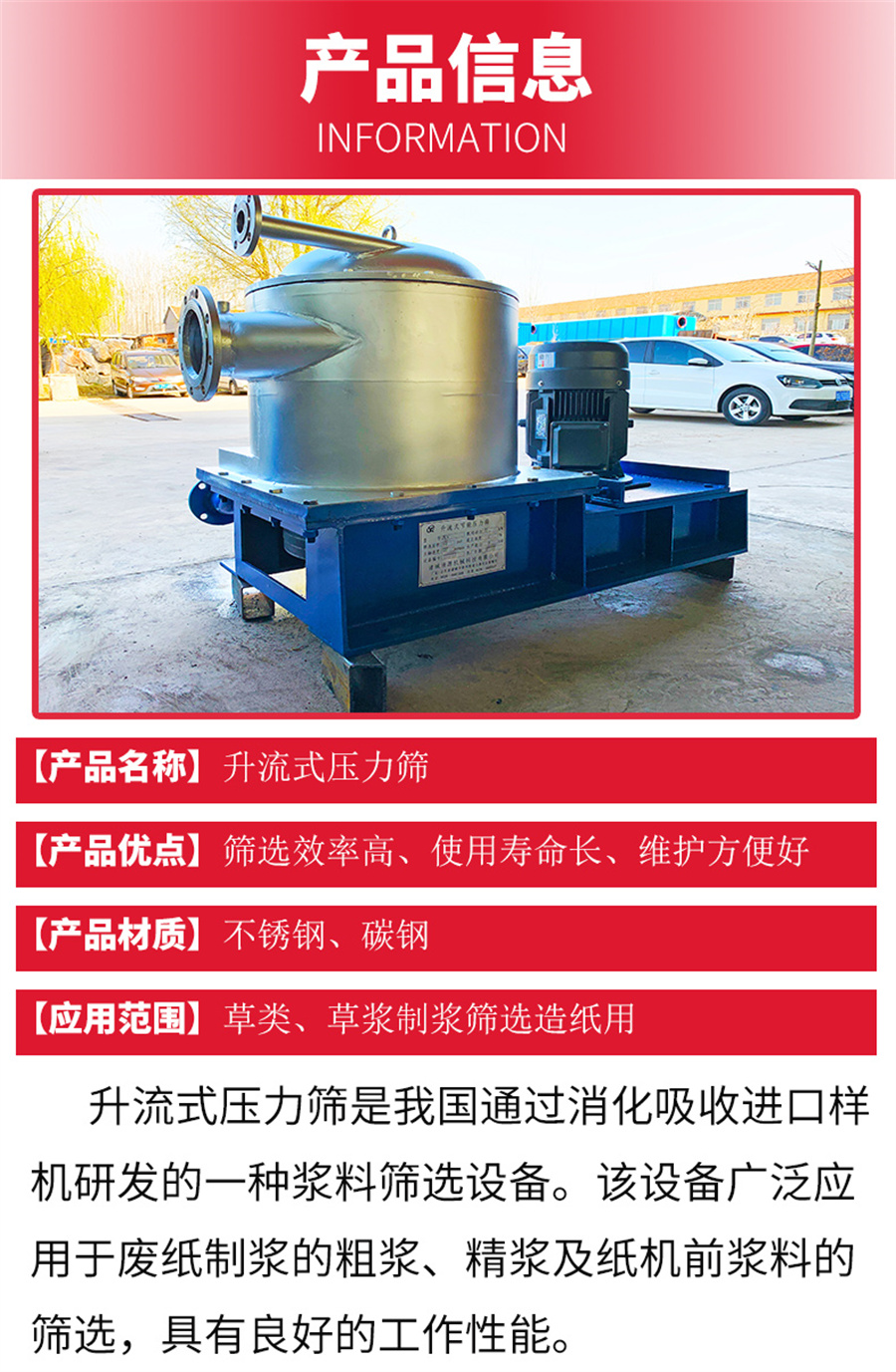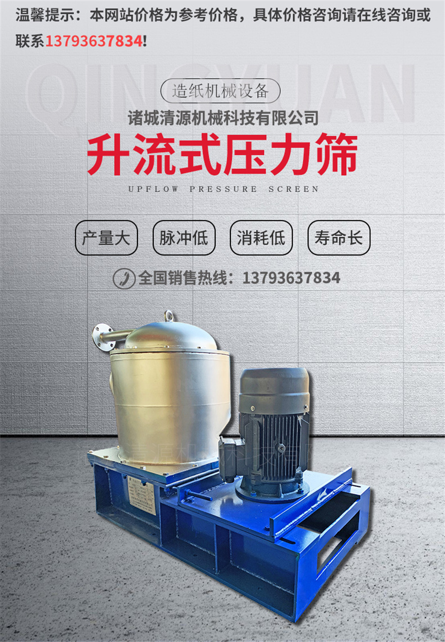 升流式壓力篩作為制漿造紙的通用設(shè)備,壓力篩有著不可替代的作用。 我公司生產(chǎn)的升流式壓力篩、內(nèi)流式壓力篩及多級(jí)篩自2001年進(jìn)入市場(chǎng)以來創(chuàng)下了年產(chǎn)二百多臺(tái)的輝煌成績(jī)。目前公司生產(chǎn)的壓力篩可用不銹鋼(304)和A3板兩種材料制作,精鑄304葉片和轉(zhuǎn)子,進(jìn)出漿管路(漿料濃度)可選用自動(dòng)控制,既減少了人工操作,又提高了生產(chǎn)效率。篩鼓采用進(jìn)口技術(shù)加工制作,篩縫據(jù)均勻,開孔率高,耐磨,使用周期長(zhǎng)。 主要用于紙機(jī)前低濃漿料的篩選,能有效的去除雜質(zhì)和疏散漿料,從而提高紙張質(zhì)量。